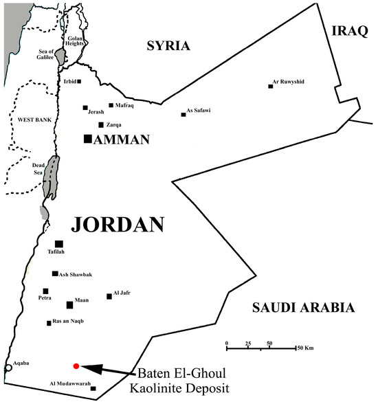 A sample of natural kaolinitic clay was collected from the Baten El-Ghoul deposit, which is located in the southern part of Jordan (Figure 1), and used as a solid precursor for the synthesis of analcime/sodalite composite material. The mineralogical, chemical, and morphological properties of this clay sample were examined and reported elsewhere [38]. According to Esaifan et al. [38], the major component (~68%) in this sample was kaolinite, Al2O3∙2SiO2∙2H2O. The other components include quartz (SiO2), calcite (CaCO3), hematite (Fe2O3) and illite (K,H3O)(Al,Mg,Fe)2(Si,Al)4O10[(OH)2,(H2O)]). Dodecyl trimethylammonium bromide (99%—ACROS Organics, Waltham, MA, USA) was used as the organic template for pore enlargement to obtain a reticular mesoporous composite structure. Sodium hydroxide (NaOH, 99.0%, Loba Chemie, Mumbai, India), ethanol (Gainlland chemical company, Deeside, UK). All solutions were made from the above-mentioned reagents without further purification. The reagents were dissolved in Milli-Q water (Millipore Advantage 10, Millipore, Merck KGaA, Darmstadt, Germany). All experiments were performed at ambient conditions unless mentioned otherwise.