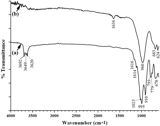Infrared spectra of the (a) kaolin starting material and (b) synthesized zeolites composite.