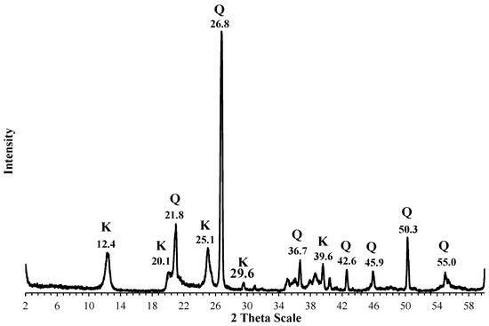 XRD diffractogram of thekaolinitic-rich clay (K: kaolinite, Q: quartz).