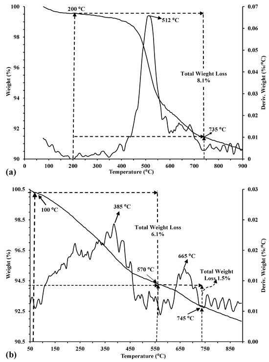 The thermal stability of the kaolinitic-rich clay and synthesized zeolites composite were investigated using TGA and DTG analyses;their curves are illustrated in Figure 5a and Figure 5b, respectively. One sharp endothermic peak was observed for the kaolinitic-rich clay (Figure 5a) at heating temperatures ranging between 200–735 °C to achieve a maximum peak at 512 °C with a total weight loss of 8.1%. According to Esaifan et al. [38], this endothermic step is attributed to the dehydroxylation of kaolinite and corresponds to a kaolinite content of 68%. Two-step weight loss was observed on the TGA curve of the synthesized zeolite composite (Figure 5b). For the synthesized zeolite composite (Figure 5b), the TGA curve showstwo-step weight losses, indicating the presence of two zeolite types. Obvious weight losses were attributed to molecular structural water (known as zeolitic water), with values of 6.1% and 1.5% for analcime and sodalite, respectively. A total dehydration of analcime occurred at about 385 °C, which was comparable to the natural analcime [38], but that of sodalite was as high as 665 °C, indicating better thermal stability.