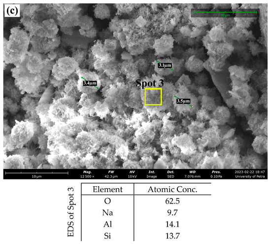 Figure 6 shows the SEM micrographs and the results for EDX spectral analysis for the kaolinitic clay starting material and the prepared zeolitic composite. The micrographs in Figure 6a show a flaky, nonhomogeneous, and layered kaolinitic clay, and EDS analysis displayed for kaolinitic clay starting material shows an Al-to-Si approximate ratio of 1.08, which is typical for natural kaolinite raw material. The micrographs for the synthesized analcime and sodalite composite show the complete disappearance of the former kaolinitic clay structures and the appearance of two distinct crystalline phases (Figure 6b,c). The first phase is the icositetrahedron analcime crystals with crystal size ranging between 30–40 µm (Figure 6b), and the EDS analysis for analcime displayed that the ratio of Si-to-Al is about 0.82, which is less than both the raw kaolinite and sodalite phase as adversely affected by the presence of carbon attributed to the residual surfactant in analcime crystal. Asit appears in Figure 6c, the second phase is composed of sodalite crystals with a wool ball-like morphology of 3–4 µm in size. The EDS analysis of this phase (Figure 6c) displayed a ratio of Si-to-Al equal to 1.03, which is higher than in the case of the analcime phase due to the inclusion of sodium ions in the sodalite structure instead of carbon, which is heavier.