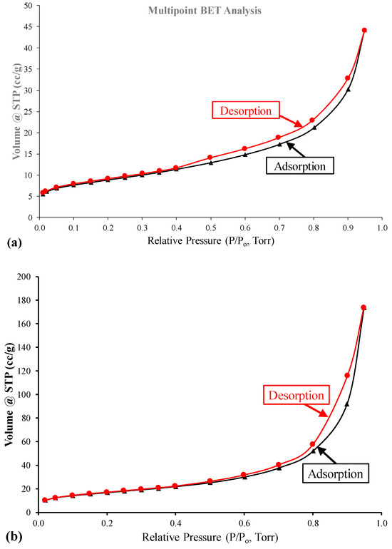 N2 adsorption-desorption isotherms for the (a) kaolinitic-rich clayand (b) synthesized zeolites composite.