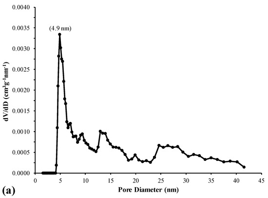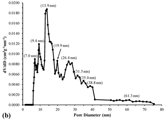 The pore size distribution curves for the kaolinitic-rich clay starting material and the analcime/sodalite mixture are presented in Figure 8. The kaolinitic-rich clay is basically nano-porous with a mean size of 3.6 nm. The synthesized mesoporous analcime/sodalite mixture has a pore diameter between 4 and 75 nm with a mean value of 12.8 nm. This wide range of pore size might be due to the fact that the pore size in the zeolitic analcime is different from that in sodalite [39].