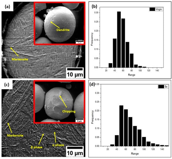- The martensite percentage in the virgin powder was relatively high. After recycling five times, the powder particles’ microstructure changed visibly. Various microstructural features, like α bulges, a large α phase, and β phases, were discovered in the five-times-recycled powders. Also, the EDS results indicate that the surface area had a greater concentration of Al than the interior region of the powder. The O concentration seemed to be higher with powder recycling.