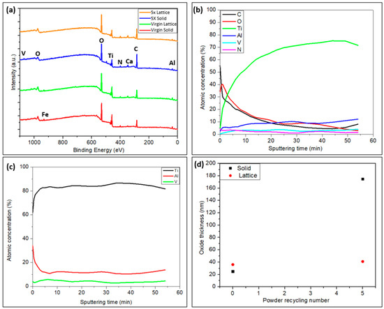 - The implant samples created with recycled powder showed a rise in oxide thickness in both the solid and lattice regions, at least locally, attributed to the higher O concentration observed in the recycled powder due to the repeated recycling process. This seems to be beneficial for implant–tissue interaction. In addition, the enrichment in the Al at the surface points out the possibility of the formation of aluminum oxides at the surface.