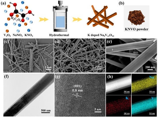 (a) Schematic illustration of the production of KNVO. (b) Photograph of KNVO powder. (c) SEM image of NVO. (d,e) SEM images of KNVO. (f,g) TEM and HRTEM images of KNVO. (h) STEM and elemental mapping images of KNVO.