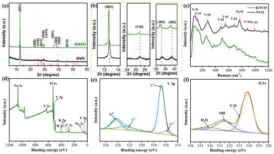 (a) XRD patterns of KNVO and NVO and (b) their high-resolution patterns of (001), (110), (−303), and (302) planes. (c) Raman spectra of KNVO and NVO. (d) XPS spectrum of KNVO. XPS spectra of (e) V 2p and (f) O 1s, respectively.