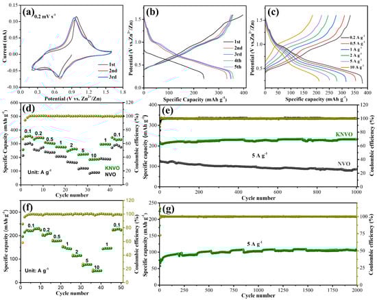 (a) CV curves of KNVO at 0.2 mV s−1. (b) The first five GDC profiles of KNVO at 0.1 A g−1. (c) The GDC curves of KNVO from 0.2 to 10 A g−1. (d) Rate capability of KNVO and NVO cathodes. (e) Long-term cycling stability of KNVO and NVO cathodes. (f) Rate capability of KNVO at high mass loading. (g) Cyclic life of KNVO at high mass loading.