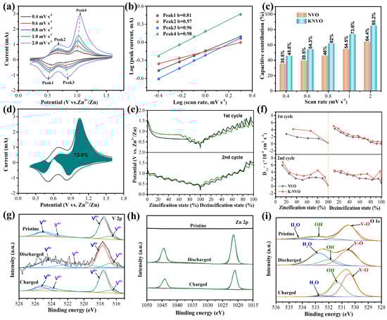 To further investigate the electrochemical evolution of KNVO, the CV curves were tested with various sweep rates. As demonstrated in Figure 4a, two distinct couples of oxidation reduction peaks are found in all CV curves from 0.4 to 2.0 mV s−1, suggesting that the electrode occurs a multi-step insertion–extraction process. The shape of CV profiles remains similar when increasing the scan rate, except that redox peaks shift in a certain direction due to the polarization effect. Generally, the power–law correlation between peak current (i) and sweep rate (v) is obeyed to the equation of (a and b represent the adjustment coefficients), where the b value is in the range of 0.5 to 1 [5,14,43]. When the b value is close to 0.5 and 1, it indicates that the redox reaction process is dominated by a faradaic diffusion behavior and capacitive behavior, respectively [5,17,44]. By fitting plots of log(i) and log(v), these peaks 1, 2, 3, and 4 have b values of 0.81, 0.57, 0.96, and 0.98, respectively (Figure 4b), which is superior to that of the NVO cathode (Figure S7). Additionally, the contribution ratios of capacitive behavior () and diffusion dominated behavior () can be calculated from the formula [37,44]. As presented in Figure 4c,d, the capacitive contribution of the KNVO cathode ranges from 45% to 85.2% at a sweep rate of 0.4 to 2 mV s−1, which is higher than that of the NVO cathode (Figure S8, from 35.5% to 64.4%). These results show that the KNVO cathode is mainly dominated by a capacitive behavior during the Zn2+ insertion–extraction process, which could be ascribed to the pre-intercalation of the K, reducing the Zn2+ migration barrier and allowing for the fast Zn2+ insertion–extraction. To confirm this, the Zn2+ diffusion coefficient of the KNVO and NVO electrodes during the 1st and 2nd GDC processes were calculated from the galvanostatic intermittent titration technique (GITT) curves, the results of which are displayed in Figure 4e,f. Obviously, the Zn2+ diffusion coefficient can be calculated to be 1.2 × 10−9 to 7.2 × 10−9 cm−2 s−1 in the 1st cycle and 2nd cycle, and the Zn2+ diffusion coefficient of KNVO cathode is superior to that of the NVO cathode, which manifests the outstanding reaction kinetics in the KNVO. These results are in agreement with the EIS test (Figure S9) and declare its superb rate performance.