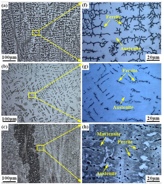 Figure 11 shows the microstructure of welded joints under different welding heat inputs observed by OM, SEM and SEM-EDS area scans. The microstructure of welding heat input with 0.645 kJ/mm and 0.962 kJ/mm consists e of the δ phase and A phase, with the δ phase distributed randomly in the A phase matrix (see Figure 11a,b,e,f). For the welding heat input of 0.645 kJ/mm and 0.962 kJ/mm, the morphology of the δ phase is shown to be dendritic-like, worm-like and globular-like, respectively. The microstructure of the welding heat input with 1.765 kJ/mm consists of the M phase, δ phase, and A phase. The δ phase is distributed in the A phase and the interface between the M phase and A phase (see Figure 11c,g). The microstructure of the welding heat input with 2.860 kJ/mm consists of the M phase and A phase (see Figure 11d,h). As the welding heat input increases, the content of the Cr and Ni elements in the weld metal gradually decreases (Figure 11i).
