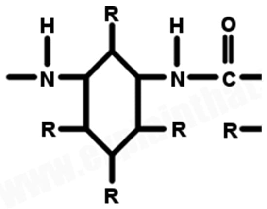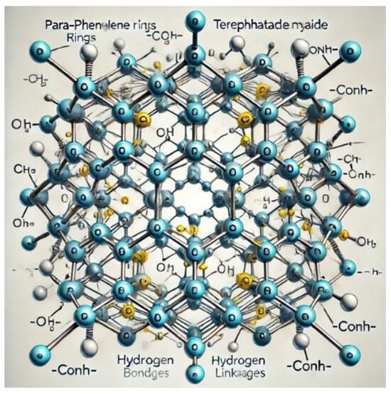 Atomic Bonds (or bonding): The atomic bonds consist of (i) phenylene rings, which are hexagonal rings made of carbon atoms, connected by alternating single and double bonds, (ii) amide groups, which are rings connected by amide linkages (-CONH-), forming hydrogen bonds with neighboring polymer chains, and (iii) hydrogen bonds, which are interactions among hydrogen atoms of the amide groups, and the oxygen atoms of other amide groups provide thermal stability and flame resistance.