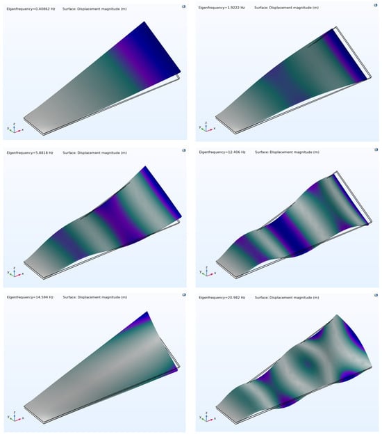 (1) Eigenfrequency Analysis: The initial six eigenmodes, computed using the multiple model method, are illustrated in Figure 7. Eigenmodes obtained through the layerwise and ESL theories closely resemble those derived from the multiple-model method and are therefore not included here.