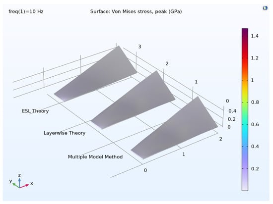 (2) Frequency Domain Analysis: Figure 8 showcases the graphical representation of the von Mises peak stress distribution for each modeling technique. The illustration demonstrates a notable similarity between the stress patterns produced by the multiple-model method and the layerwise approach, both in their distribution and peak intensity. In contrast, a slight variation is observed in the stress distribution when utilizing the ESL theory.