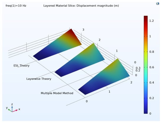 The frequency domain results regarding displacements are presented in Figure 9 for each modeling approach. Once again, the outcomes obtained from the multiple-model method closely match those of the layerwise theory, whereas the ESL theory shows inaccuracies in predicting both displacement distribution and peak values.