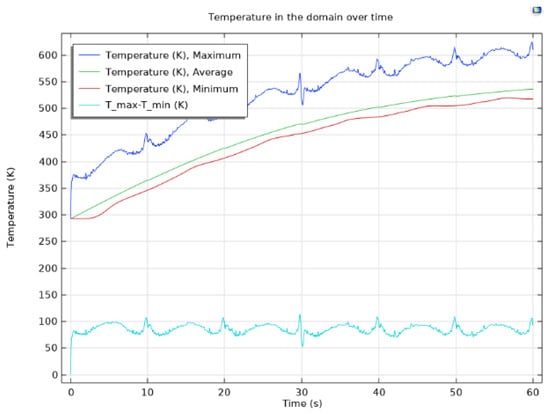 Maximum, minimum, and average temperatures of the composite material as functions of time.