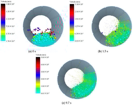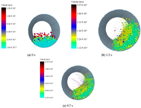 We investigated the influence of different densities of grinding balls on ball motion patterns. Therefore, we simulated the ball motion patterns during mill operation, and Figure 2, Figure 3, Figure 4 illustrate the motion of grinding balls at varying densities. Under a grinding medium density of 3.8 g/cm3 (Figure 2), at 0 s, particles are just beginning to rotate after being generated, and the simulation starts with the formation of a filled bed of balls and material in a static mill (Figure 2a). At 1.5 s into the simulation (Figure 2b), the grinding balls and materials begin to make contact and grind together. By 9.7 s (Figure 2c), the majority of the materials have been ground and broken into small particles that are moving within the mill. Some larger, unbroken materials remain on one side of the mill, continuing to undergo grinding. Figure 3 and Figure 4 illustrate the ball movement patterns with grinding medium densities of 5.8 g/cm3 and 7.8 g/cm3, respectively. The ball movement patterns across the three grinding medium densities are largely similar. However, at 9.7 s, a considerably greater number of particles have been broken in the models with grinding medium densities of 5.8 g/cm3 and 7.8 g/cm3 than in the model with a grinding medium density of 3.8 g/cm3. These ball motion patterns are consistent with the results of previous studies [16,17,18].