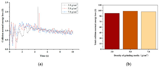 Therefore, we conducted simulations using grinding media with different densities. The results of the collision normal energy simulations for various grinding medium densities are presented in Figure 5. Figure 5a illustrates the collision normal energy generated between the grinding media and the material at each time point from 0 to 10 s. Most losses for all three types of grinding media fall within the range of 0.5–1.5 J. Figure 5b displays the total collision normal energy lost by each density of grinding media after 10 s of simulation. The collision normal energy obtained using grinding media with a density of 5.8 g/cm3 is considerably higher than that obtained using grinding media with a density of 3.8 g/cm3 and slightly greater than that obtained using grinding media with a density of 7.8 g/cm3. This illustrates that grinding media with a density of 5.8 g/cm3 undergo more alterations in instantaneous velocity during the simulation process, thereby achieving a relatively better grinding effectiveness.