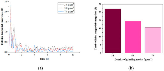 Figure 6 displays the simulation results of collision tangential energy for grinding media with varying densities. In Figure 6a, the collision tangential energy generated between the grinding media and the material at each time point within 0–10 s is illustrated. Most losses for all three types of grinding media fall within the range of 0–0.5 J during stable model operation. Figure 6b displays the total collision tangential energy lost under each grinding medium density after 10 s of simulation. The total collision tangential energy lost decreases with increasing grinding medium density from 3.8 g/cm3 to 5.8 g/cm3 and 7.8 g/cm3. This trend is attributed to the lighter weight of the grinding media with a density of 3.8 g/cm3, which requires more energy loss to break the material during its curved motion. Consequently, the grinding effectiveness of grinding media with a density of 3.8 g/cm3 is considerably lower than that of the media with a density of 5.8 g/cm3 because the grinding media with a density of 3.8 g/cm3 is lighter, requiring more energy to break the material during curved motion. This indicates that the grinding effectiveness of the grinding media with a density of 3.8 g/cm3 is considerably lower than that of media with densities of 5.8 g/cm3 and 7.8 g/cm3.