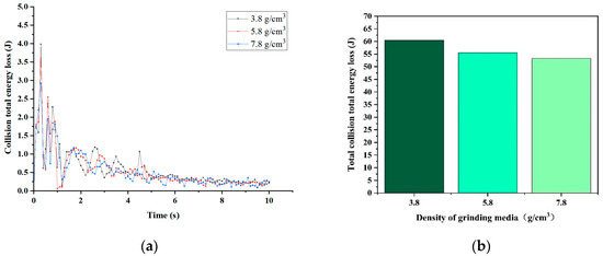 Figure 7 presents the overall collision energy loss for the three grinding medium densities. Figure 7a illustrates the energy loss at each moment, while Figure 7b summarizes the simulation results over 10 s. The total collision energy loss for each grinding medium density is illustrated in Figure 7b. The total collision energy lost decreases with increasing grinding medium density from 3.8 g/cm3 to 5.8 g/cm3 to 7.8 g/cm3. This trend suggests that grinding media with a density of 3.8 g/cm3 requires more collision energy during the grinding and crushing process to break the material. Therefore, the grinding effectiveness of media with a density of 3.8 g/cm3 is inferior to that of the other two types of grinding media.
