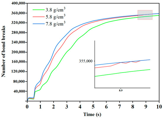 The grinding effects achieved by the three grinding medium densities over 10 s are depicted in Figure 9. Once the mill stabilizes, the number of bond breaks is consistently highest in the mill with a grinding medium density of 7.8 g/cm3 and lowest in the mill with a grinding medium density of 3.8 g/cm3. Around 8.9 s, the number of bond breaks in the mill with a grinding medium density of 5.8 g/cm3 equals or exceeds that in the mill with a grinding medium density of 7.8 g/cm3. This observation indicates that the grinding media with a grinding medium density of 5.8 g/cm3 provide superior grinding effectiveness, gradually reducing the particle size of the granular material.