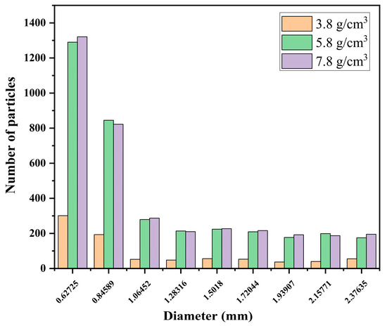 According to the simulations described above, we developed an auxiliary validation model that was verified against the Tavares model, a widely used crushing model in EDEM [23]. The particle size distribution of the material by the 9th second of simulation under the same simulation conditions as presented above is illustrated in Figure 10. At a small particle size, the grinding medium density of 5.8 g/cm3 results in a comparable or slightly better grinding effectiveness than the grinding medium density of 7.8 g/cm3.
