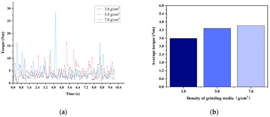 Figure 11 presents the torque data obtained from simulations using EDEM discrete element software, in which different grinding medium densities are employed. The high accuracy of the software ensures the clarity of the captured mill torque. The instantaneous torque at each moment is accurately depicted in Figure 11a. Snapshots of the instantaneous torque at different moments revealed considerable fluctuations in the ball mill torque. The EDEM software is highly responsive to changes in these instantaneous torque values. To quantify the ball mill torque values (Figure 11b), precise measurements are necessary. Figure 11b illustrates the average torque of the three grinding medium densities within the mill over a 10 s period. The average torque of the ball mill increases with the increase in grinding medium density from 3.8 g/cm3, to 5.8 g/cm3, and 7.8 g/cm3. The average torque values under densities of 5.8 g/cm3 and 7.8 g/cm3 are relatively close. Torque directly influences the power of the mill, which is calculated as the product of torque and rotational speed.