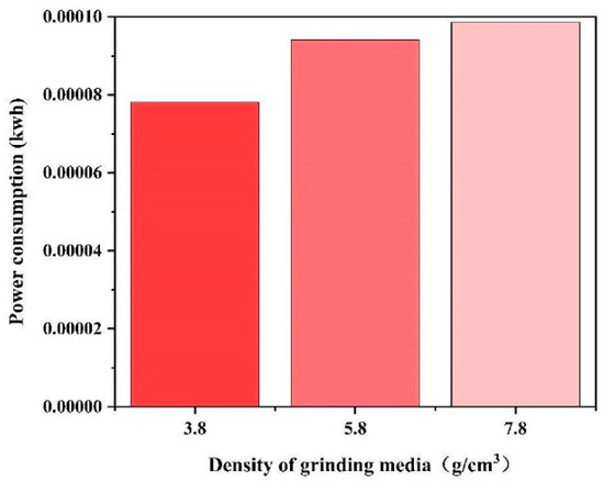 We studied the power consumption of the mill under the three grinding medium densities. The power consumption at the locations of the three different grinding media can be observed in Figure 12. Considering that the mill speeds are all constant at 75 rpm, the power trend is the same as that of the torque. Energy consumption, often referred to as the integral of power over time, is determined through the multiplication of power with time. This relationship allowed us to calculate the energy consumed during grinding with three different grinding media over 10 s (Figure 13).