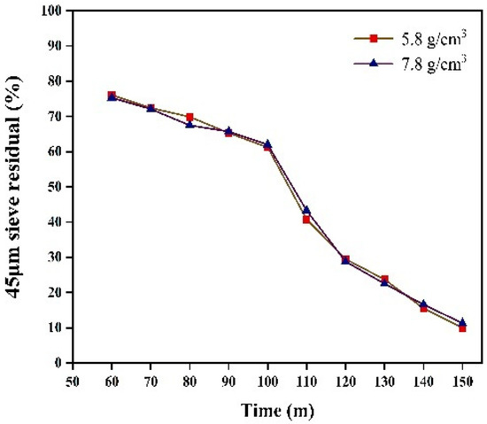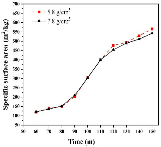 We investigated the sieve residue under the two different grinding medium densities. Sieve residue tests were conducted using a negative pressure sieve analyzer, in accordance with the Chinese industry standard JTG 3432-2024 [27]. Figure 14 shows the 80 μm sieve residues collected at 10 min intervals from 60 to 150 min for grinding medium densities of 5.8 g/cm3 and 7.8 g/cm3. The grinding effects were similar for both densities, with comparable fineness achieved at the same grinding time. Additionally, the 45 μm sieve residues under the two densities were also similar (Figure 15). Additionally, in industrial production, the use of ceramic balls to reduce energy consumption may lead to a decrease in the specific surface area. Therefore, we investigated the effect of different grinding medium densities on the specific surface area after grinding. Specific surface area tests were conducted using a specific surface area meter, in accordance with the Chinese national standard GB/T 8074-2008 [28]. Figure 16 illustrates the specific surface area of the materials after grinding under two grinding medium densities. The grinding effects of the two grinding media are nearly identical before 120 min. However, from 120 to 150 min, the grinding medium density of 5.8 g/cm3 results in a slightly better grinding effect than the density of 7.8 g/cm3. When the grinding media with a density of 5.8 g/cm3 are used to grind iron ore particles smaller than 2.5 mm, the specific surface area achieved is comparable to that obtained with the grinding media with a density of 7.8 g/cm3.