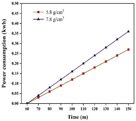 Figure 17 shows the power consumption recorded at 10 min intervals from 60 to 150 min for grinding medium densities of 5.8 g/cm3 and 7.8 g/cm3. Using the grinding media with a density of 5.8 g/cm3 resulted in a 25% reduction in energy consumption compared to that obtained using the griding media with a density of 7.8 g/cm3.