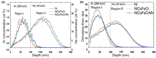 The profile of (a) implanted krypton and helium and (b) radiation damage in Ni and CoCrFeNi and CoCrFeMnNi HEAs irradiated by Kr14+ (280 keV, 5 × 1015 cm−2) and He2+ (40 keV, 2 × 1017 cm−2).