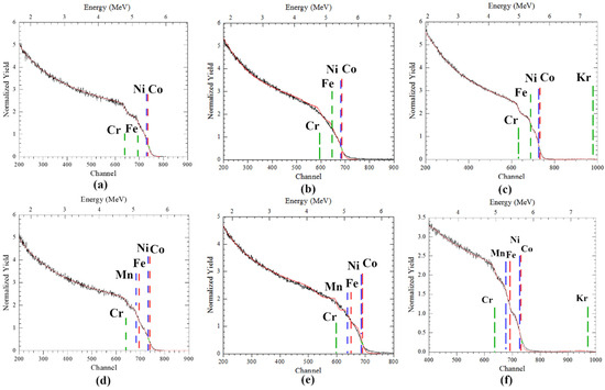 HIRBS spectra (black—experimental, red—RUMP) of: (a,d) initial [23] and irradiated by (b,e) Krypton ions, (c,f) Kr and He ions, (a–c) CoCrFeNi and (d–f) CoCrFeMnNi HEAs.
