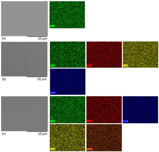 As shown by Figure 3a–c, after irradiation with low-energy Kr ions, no large defect clusters were found on the surfaces of nickel and HEAs. According to EDS maps, the constituent elements were also uniformly distributed.