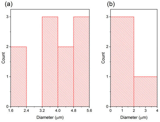 The morphology of the surface and elemental composition of the samples were analyzed by scanning electron microscopy (SEM) and energy-dispersive X-ray spectroscopy (EDX) methods on a Hitachi TM3030 microscope (Hitachi, Tokyo, Japan) at an accelerating voltage of 15 kV. Blister diameters were measured from SEM images using ImageJ software (version 1.54d) [24] and plotted as histograms.
