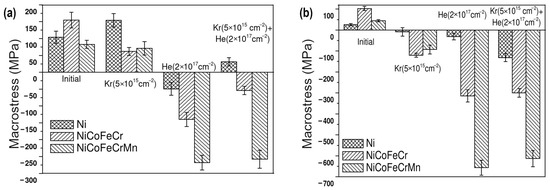 According to Figure 7a, in Region I, krypton irradiation reduces tensile macrostresses in the HEAs. Tensile macrostresses in CoCrFeNi fall to 62 MPa, and in the CoCrFeMnNi HEA, they decrease insignificantly to 71 MPa. At the same time, for nickel, the level of tensile macrostresses increases to 174 MPa. Sequential irradiation with krypton and helium ions forms compressive macrostresses in CoCrFeNi and CoCrFeMnNi HEAs equal to −54 and −258 MPa, respectively, and in nickel, tensile macrostresses reach 31 MPa. He irradiation [23] forms compressive macrostresses for all samples. In this case, it is expected that sequential irradiation with krypton and helium ions will lead to the formation of compressive macrostresses for all samples, and their level will be close to the sum of the macrostress values obtained during irradiation with krypton and helium ions separately. But Figure 7a shows such a result for Ni and CoCrFeNi. For the CoCrFeMnNi alloy, macrostresses during irradiation with helium ions and successive irradiation with krypton and helium ions coincide within the error. For nickel, sequential irradiation elevates tensile stresses.