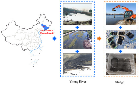 Sludge is the sediment formed by physical chemistry and biochemistry in rivers. It has a high moisture content, low strength, and high compressibility, and contains high levels of pathogens, heavy metals, and other refractory organic matter [1,2]. In China, a large amount of dredged sludge is producesd in the process of dredging rivers and lakes and from the construction of ports [3,4,5,6]. According to reports, the depth of the shallow sludge in the Yitong River, Changchun city, is 0.5–1.2 m, and the dredging volume is about 1.86 million m3. As the long-term accumulation of this sludge will produce detrimental effects on the surrounding area [7], it is urgent to take measures to deal with it.