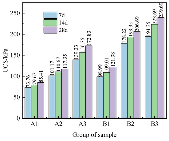 Furthermore, comparing the experimental results from specimens A and B, it can be observed that the ratio of CaO to FA has a significant impact on the UCS of the solidified sludge. The UCS of A2 and B2 is 117.35 kPa and 209.69 kPa after 28 days of curing, respectively, displaying a 78.69% increase due to the increase in the CaO/FA ratio. The reason for this is that when the proportion of the FA admixture is relatively high, most of the FA adheres to the surface of sludge particles and CaO, resulting in a reduction in the early hydration reaction process. As the curing age increases, the SiO2 and Al2O3 in FA will further react with Ca(OH)2, generating C-S-H and C-A-H network structures and enhancing the strength of the cured sludge samples. Overall, the contribution of CaO to the UCS of solidified sludge specimens is higher than that of FA. Increasing the CaO/FA ratio can improve the mechanical properties of solidified sludge.