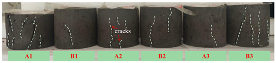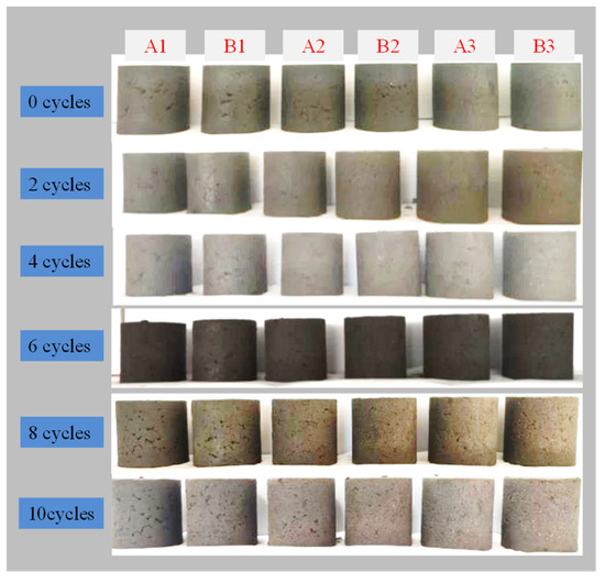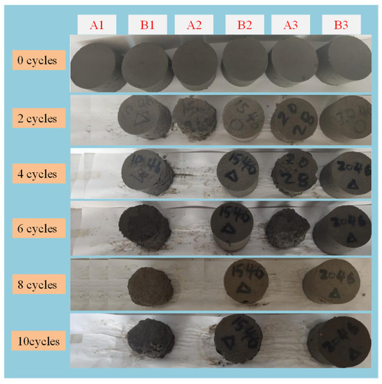 Figure 13 shows the changes in appearance of the solidified sludge after D-W cycles. It can be seen that with the increase in the number of D-W cycles, the solidified sludge specimens crumble, detach, and disintegrate. Among all the specimens, A1 and A2 suffer the most severe damage and are completely destroyed after two D-W cycles. A3 shows extensive crumbliness and detachment on the surface after six D-W cycles. For group B, only B1 detaches obviously after 10 D-W cycles, while specimens B2 and B3 are in a good condition and have better D-W cycle resistance than the other specimens.