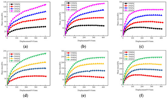Direct shear stress–displacement curve of solidified sludge samples. (a) A1; (b) A2; (c) A3; (d) B1; (e) B2; (f) B3.
