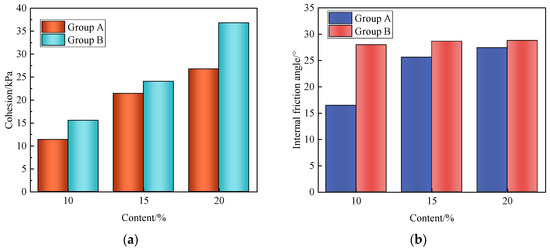 According to the Standard for Geotechnical Testing Methods (GB T 50123-2019), the cohesion and internal friction angle of solidified sludge can be obtained by using the Mohr–Coulomb law. The results are shown in Figure 6. It can be seen that both the content and proportion of the curing agent have an influence on the cohesion and internal friction angle of the solidified sludge, and the influence of the CaO/FA ratio on the cohesion is obviously higher than that on the internal friction angle.