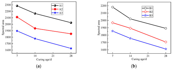 As the transverse relaxation time T2 curve of the LF-NMR is proportional to the pore size and the internal porosity can be represented by the area enclosed by the T2 spectrum and the transverse coordinate, the number of internal pores in the specimen can be characterized by the peak area of the T2 spectrum. Figure 9 shows the area of the T2 spectra of specimens with different curing ages. It can be seen that the T2 spectral area decreases with the increase in the curing age, and the decrease in the spectral areas from 7 d to 14 d is slightly greater than that from 14 d to 28 d. This means that the number of pores inside the specimens continues to decrease with the increase in the curing age, and the hydration process is faster in the early stage. After 14 days, the hydration reaction process slows down and the T2 spectral area decreases gradually. In addition, using more curing agent will lead to the consumption of more free water, which leads to the smaller difference in the T2 spectral area between 14 d and 28 d.