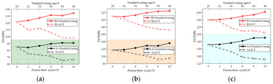 UCS of the solidified sludge samples under F-T cycles: (a) 10% curing agent content; (b) 15% curing agent content; (c) 20% curing agent content.