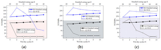 UCS of the solidified sludge samples under D-W cycles. (a) Curing agent content of 10%; (b) curing agent content of 15%; (c) curing agent content of 20%.