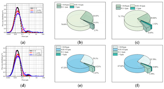 Pore size distribution of the solidified sludge samples under D-W cycles. (a) Pore size distribution of B2; (b) B2-N = 2 cycles; (c) B2-N = 10 cycles; (d) pore size distribution of B3; (e) B3-N = 2 cycles; (f) B3-N = 10 cycles.