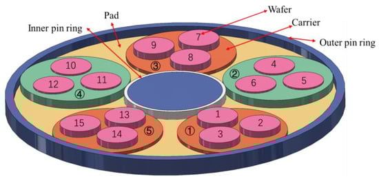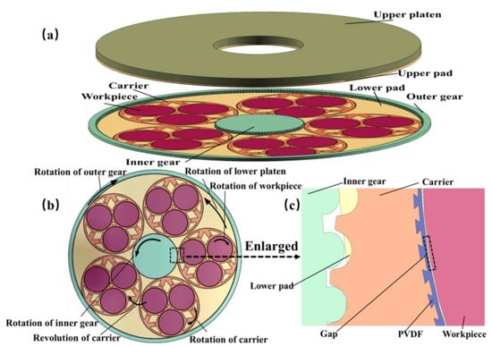 DSP has become an indispensable step in chip substrate processing, owing to its efficiency in material removal from both the upper and lower surfaces compared with single-sided polishing (SSP), which brings a more complex stress situation [1,2,3,4,5]. In DSP, the silicon wafer is placed in the carrier, which is “sandwiched” by upper and lower pads. Controlled by the inner and outer gears, the wafer rotates and revolves within the carrier, while the upper pad and the lower pad rotate respectively, as shown in Figure 1 [6,7]. The wafer contacts with pad and slurry particles under pressure, thus generating friction to remove material [8].