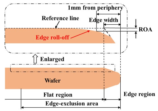 During the polishing process, the manifestation of a significant reduction in wafer edge thickness due to irregularities in wafer edge polishing is called “ERO”, which is very common in DSP [9,10,11]. This phenomenon detrimentally impacts the wafer edge planarity, thus prompting the imperative inquiry into the factors leading to edge roll-off, as shown in Figure 2 [12,13].