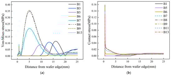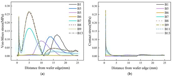 The von Mises stress on the lower surface, as shown in Figure 6a, differs only in the magnitude of the values, and the fluctuation trend is almost the same compared to the von Mises stress on the upper surface, as shown in Figure 5a. The contact stress on the lower surface, as shown in Figure 6b, has the same conclusion when compared with the contact stress on the upper surface, as shown in Figure 5b. It can be concluded that the edge roll-off locations on the upper and lower surfaces of the wafer are almost the same, but there is a difference in the magnitude of the edge roll-off.