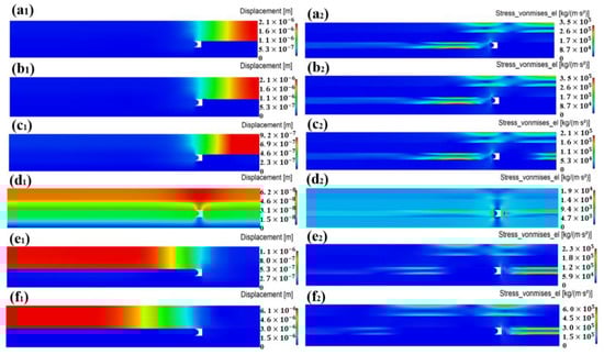 Displacement and stress diagrams for different contact states ((a1,a2): B13; (b1,b2): B9; (c1,c2): B7; (d1,d2): B6; (e1,e2): B5; and (f1,f2): B1).