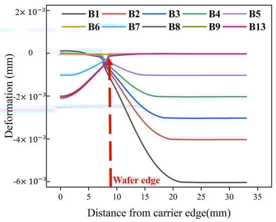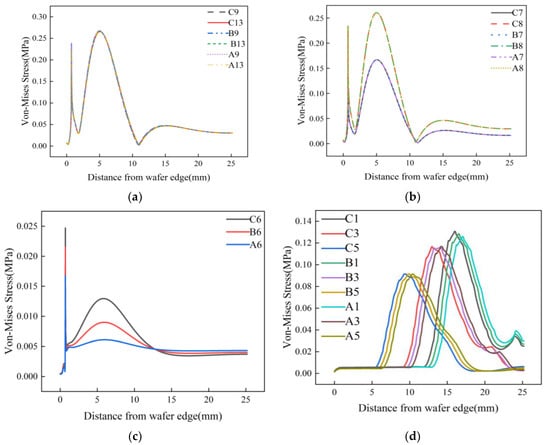 It can be observed from Figure 14a,b that when the Jut-out is greater than 0 μm, the stress curves for different gaps of Jut-out overlap with each other. Although there is a decrease in peak stress values when crossing the critical value, the stress curves for different gaps still overlap under the same Jut-out conditions. As the Jut-out decreases to 0 μm, as shown in Figure 14c, the stress curves for different gaps begin to separate. When gap = 1 mm, both peak values of the von Mises stress curve are the maximum values among the three gap states. When gap = 0 mm, the peak values are the minimum values among the three gap states, and the overall stress curve is smoother. The stress curve for gap = 0.5 mm lies between these two scenarios. When the Jut-out is less than 0 μm, as shown in Figure 14d, increasing the gap causes the peak values of the von Mises stress curve to shift to the wafer center, with no significant differences observed in the stress peak values and curve trends under the same Jut-out conditions, which implies a decrease in the edge roll-off.