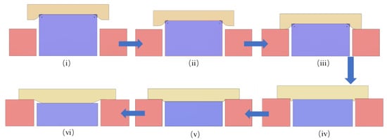 Based on the stress and pad deformation analysis above, the DSP process can be divided into six stages, as shown in Figure 9: