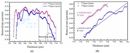 The removal rate of material as a function of wafer thickness with two carrier thicknesses (775 μm and 779 μm). (a) The whole process; (b) linear fit to the descending stage. (Reprinted from [34], Tao Wei, Yun Liu, Minghao Li, Lei Zhu, Wenjie Yu, Zhongying Xue, Xing Wei, Experimental and numerical analysis of wafer-to-wafer uniformity in double-sided polishing/Influence of the carrier thickness on the wafer-to-wafer thickness variation, Pages No.386, Copyright (2024), with permission from Elsevier [Or Applicable Society Copyright Owner]).